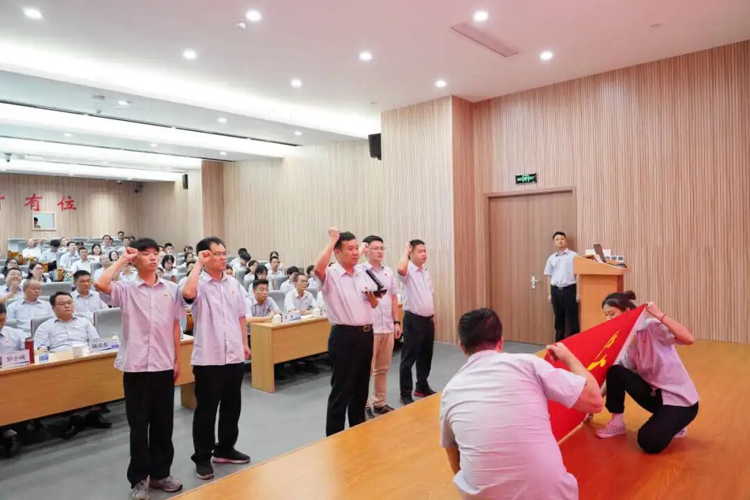 “我志愿加入中國共產(chǎn)黨,擁護(hù)黨的綱領(lǐng),遵守黨的章程…”,大會在新黨員入黨宣誓儀式中正式拉開帷幕。2022年新發(fā)展的4名黨員代表舉起右拳,面對黨旗莊嚴(yán)宣誓,許下為共產(chǎn)主義奮斗終身的錚錚誓言。公司黨委書記、董事長楊金洪領(lǐng)誓。